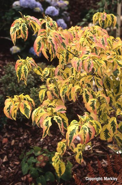 Buntlaubiger Zierstrauch mit roter Maiblüte